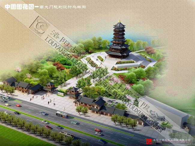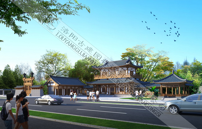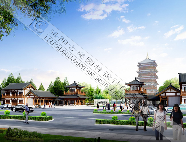 本次設(shè)計(jì)依托國花園總體規(guī)劃和公園現(xiàn)狀,以完善基礎(chǔ)設(shè)施建設(shè),合理布置公園南入口及服務(wù)用房,組織公園游覽路線。國花園南大門位于城市軸線上,緊鄰洛陽市主干道隋唐城路,是國花園位于洛隋唐城路主要出入口。國花園南大門的建設(shè)使洛陽市城市軸線更加完整突出,同時(shí)豐富隋唐城路沿街景觀,展示洛陽古都風(fēng)采和牡丹文化,更好地為城鎮(zhèn)居民及外地游客服務(wù)。主要設(shè)置有游客服務(wù)中心、售票處、管理房、醫(yī)務(wù)室等。設(shè)置足夠的公共空間以滿足游客服務(wù)與大門管理。東西服務(wù)管理用房以南大門入口廣場(chǎng)為中心對(duì)稱布置。建筑以房屋功能分為各個(gè)相對(duì)獨(dú)立單體,平面以矩形為主要構(gòu)成形式組合,簡(jiǎn)潔靈活,每個(gè)單體均設(shè)獨(dú)立主出入口,方便疏散??紤]隋唐城遺址的歷史地段及洛宜路沿街景觀效果要求等諸多因素,服務(wù)區(qū)建筑設(shè)計(jì)為唐代風(fēng)格仿古建筑群,屋頂出檐深遠(yuǎn),斗拱、梭柱等具有明顯唐代建筑符號(hào)的運(yùn)用,體現(xiàn)出恢弘大氣的唐代建筑形象,豐富隋唐城路沿街景觀,展示洛陽古都風(fēng)采。